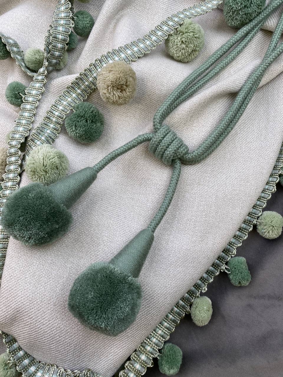 Бахрома с крупными пушистыми шариками придает шторам особый шарм и привлекает внимание своей мягкостью и объемом. Она создает приятную тактильную текстуру и добавляет нотку игривости в ваше пространство. Бахрома может быть пришита к нижнему краю шторы или использоваться как отдельный элемент, который можно легко добавить или убрать по желанию.
