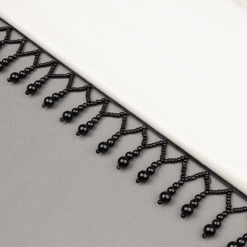 Применяется для декоративной отделки одежды, белья, головных уборов, перчаток, обуви, а также для сценических костюмов.У нас в наличии Бахрома с жемчугом 3108 черный (ширина 5 см, декор 4.2 см), артикул 00086142 в отличном качестве.Характеристики