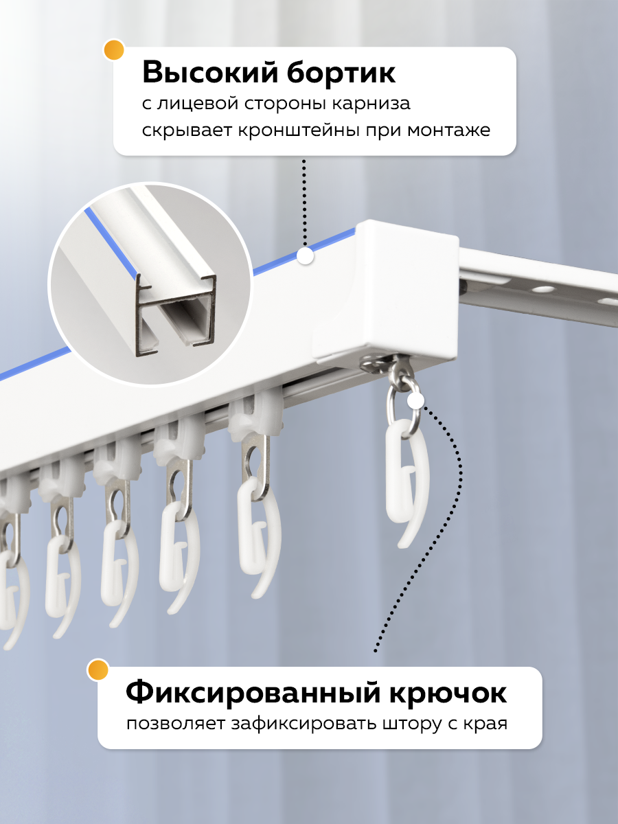 - Высокий бортик с лицевой стороны карниза скрывает кронштейны при монтаже