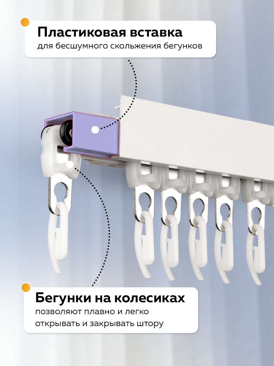 Каркас изготовлен из прочного алюминиевого материала, что обеспечивает долговечность и надежность. Внутри пластиковая вставка и роликовые бегунки – уникальная технология для бесшумного и плавного скольжения по профилю.- Компактная упаковка при любой длине карниза