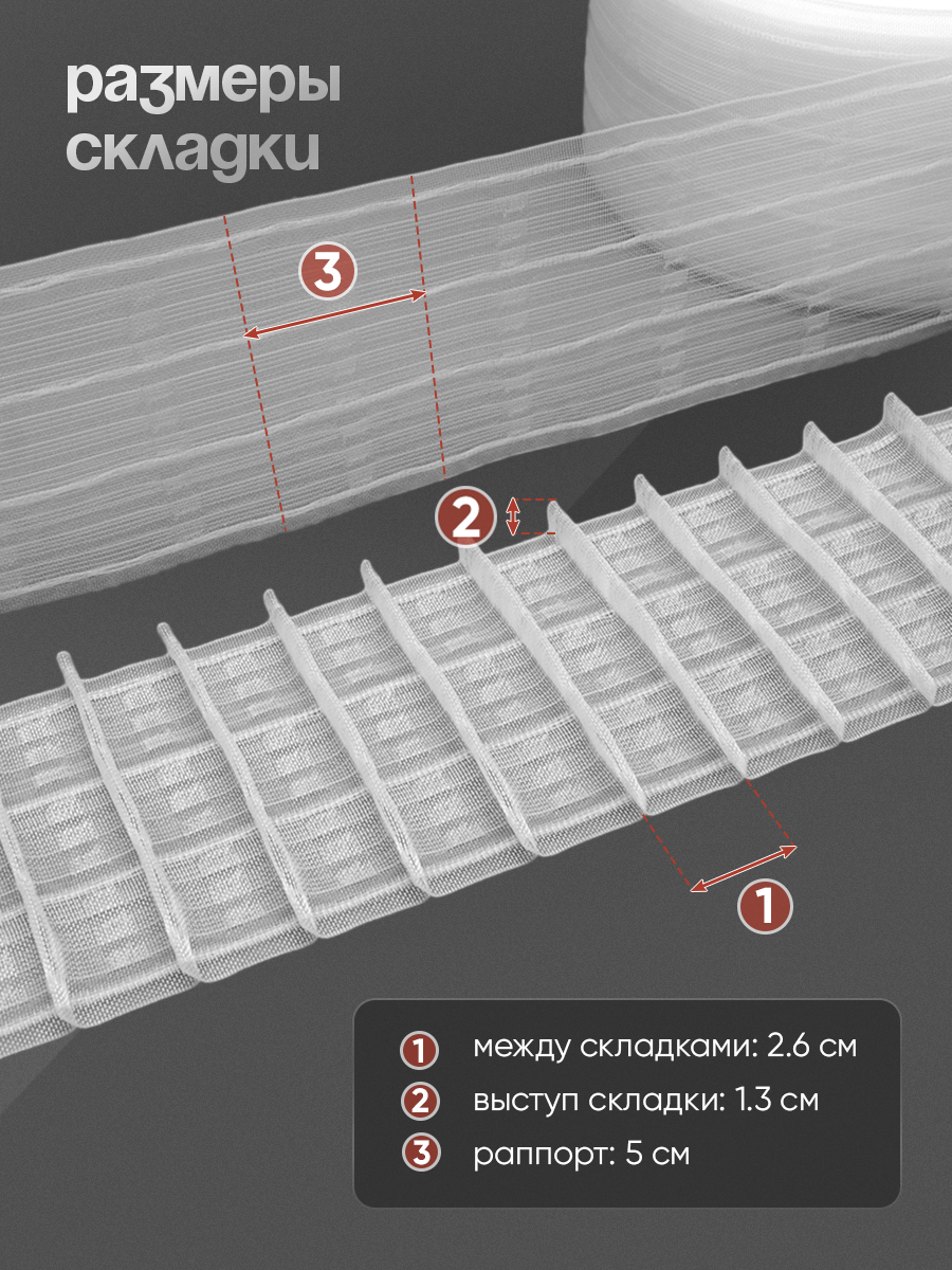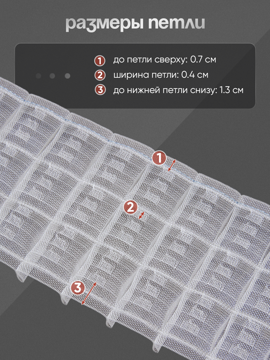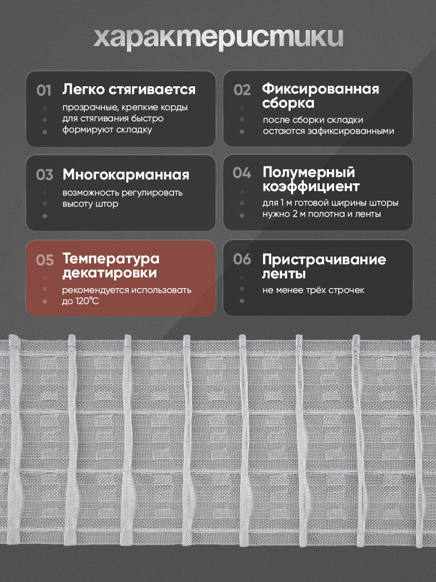 Особенности: широкая 10 см, фиксированные складки, популярный коэффициент, многокарманная - возможность регулировать высоту у готового изделия. Близкое расположение петель по высоте, что позволяет захватить крючком сразу 2 петли, для лучшей фиксации крючка и статичности шторы. Средний выступ складки 1.3 см, сформирует красивую драпировку у шторы из тонких тканей. С краю бледно-голубая строчка, которая означает коэффициент сборки ленты 1:2.