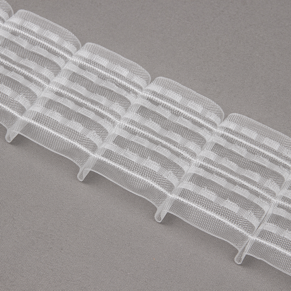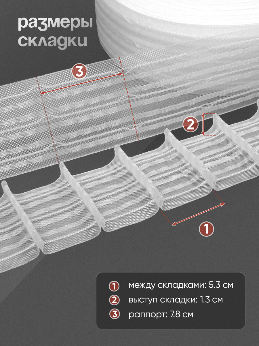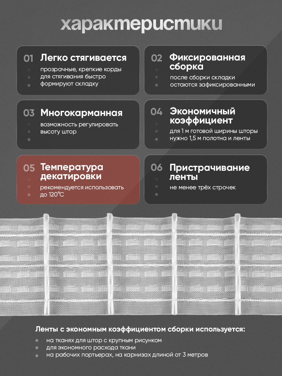 Особенности: широкая 8 см, фиксированные складки, с экономным коэффициент 1:1.5, многокарманная - возможность регулировать высоту у готового изделия. Небольшой выступ складки 1.3 см, сформирует красивую драпировку у шторы. Принадлежит к серии лент с разными коэффициентами, прозрачные, тканые: 1:1.5, 1:2, 1:2.5.