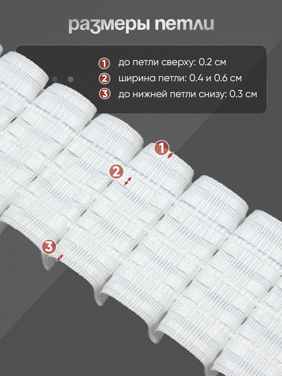 Особенности: широкая 7.6 см, мягкая, фиксированные складки, популярный коэффициент 1:2, многокарманная - возможность регулировать высоту у готового изделия. Близкое расположение петель по высоте, что позволяет захватить крючком сразу 2 петли, для лучшей фиксации крючка и статичности шторы, ниточные петли можно разделять и например, использовать 1.5 шт. Средний выступ складки 1.5 см, для тонких, средней толщины и толстых тканей. С краю бледно-голубая строчка, которая означает коэффициент сборки ленты 1:2. рекомендуем одевать крючок сразу за две петли располагающиеся по краям складки или использовать двойной крючок "Улитка". Для тяжелых штор, крючок одевать сразу за две петли располагающиеся по высоте ленты. можно использовать петли внутри складки, тогда выступ ленты вперед будет меньше.
