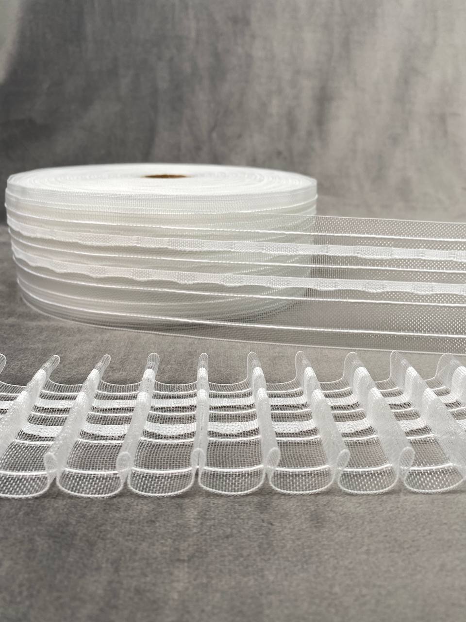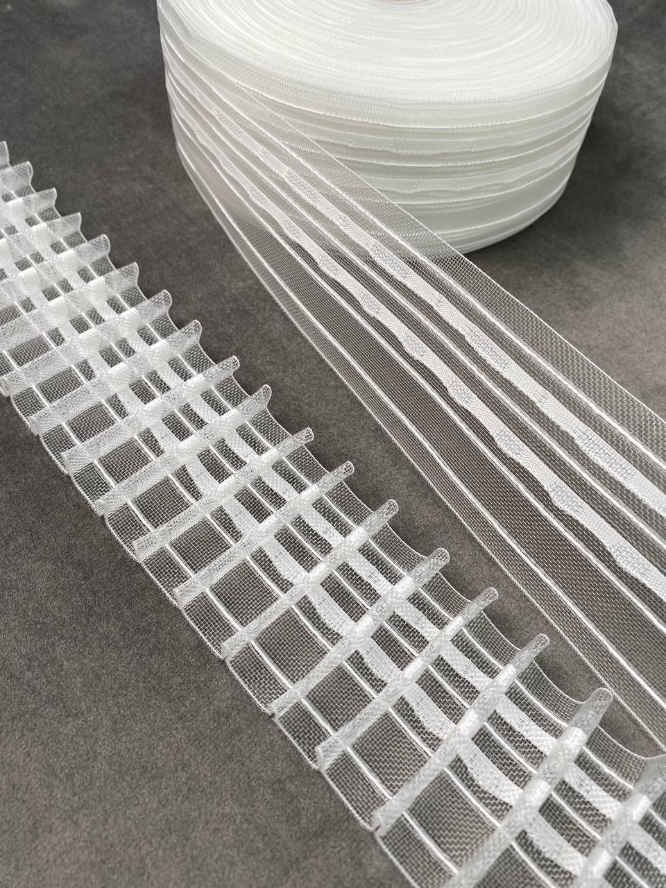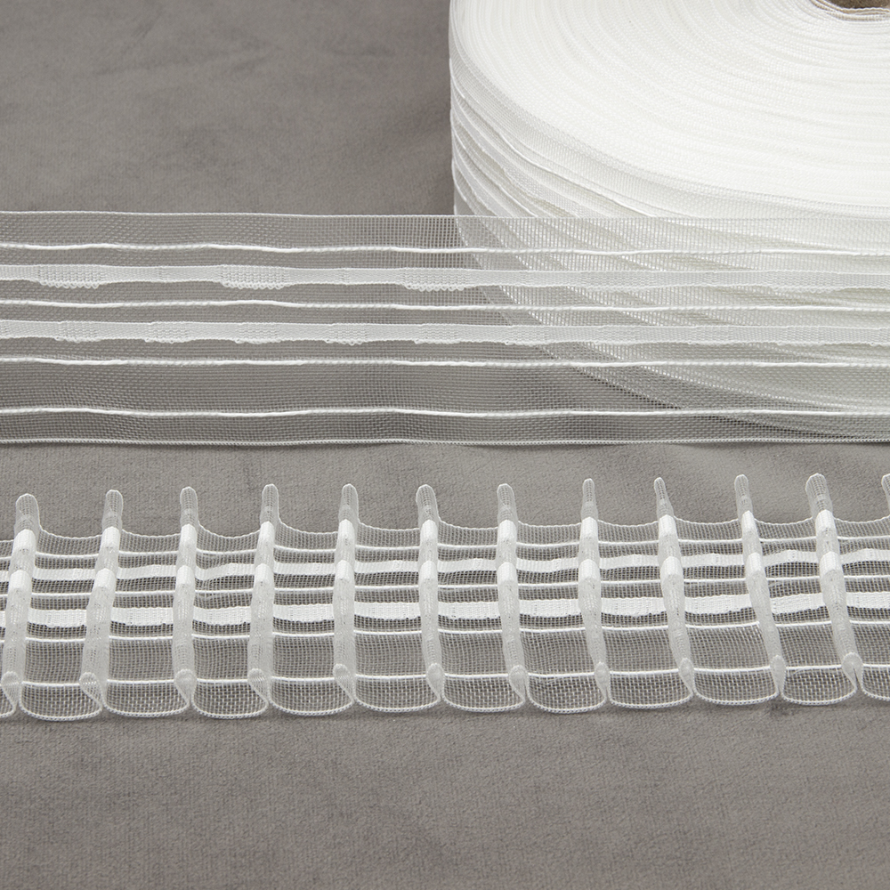 - Особенности: средняя ширина 6 см, фиксированные складки, низкая цена, пользуется большим спросом для пошива штор на маркетплайсы и эконом-объекты.