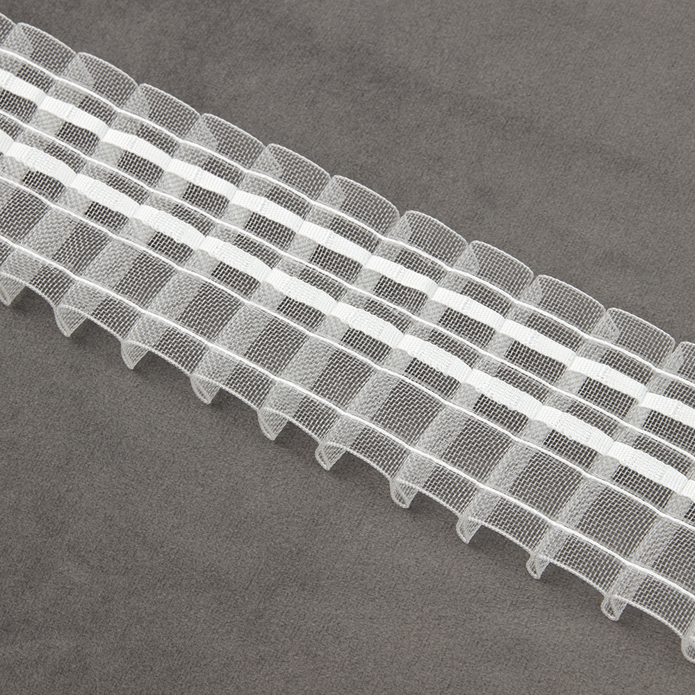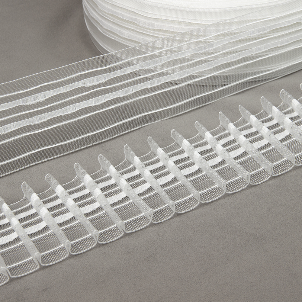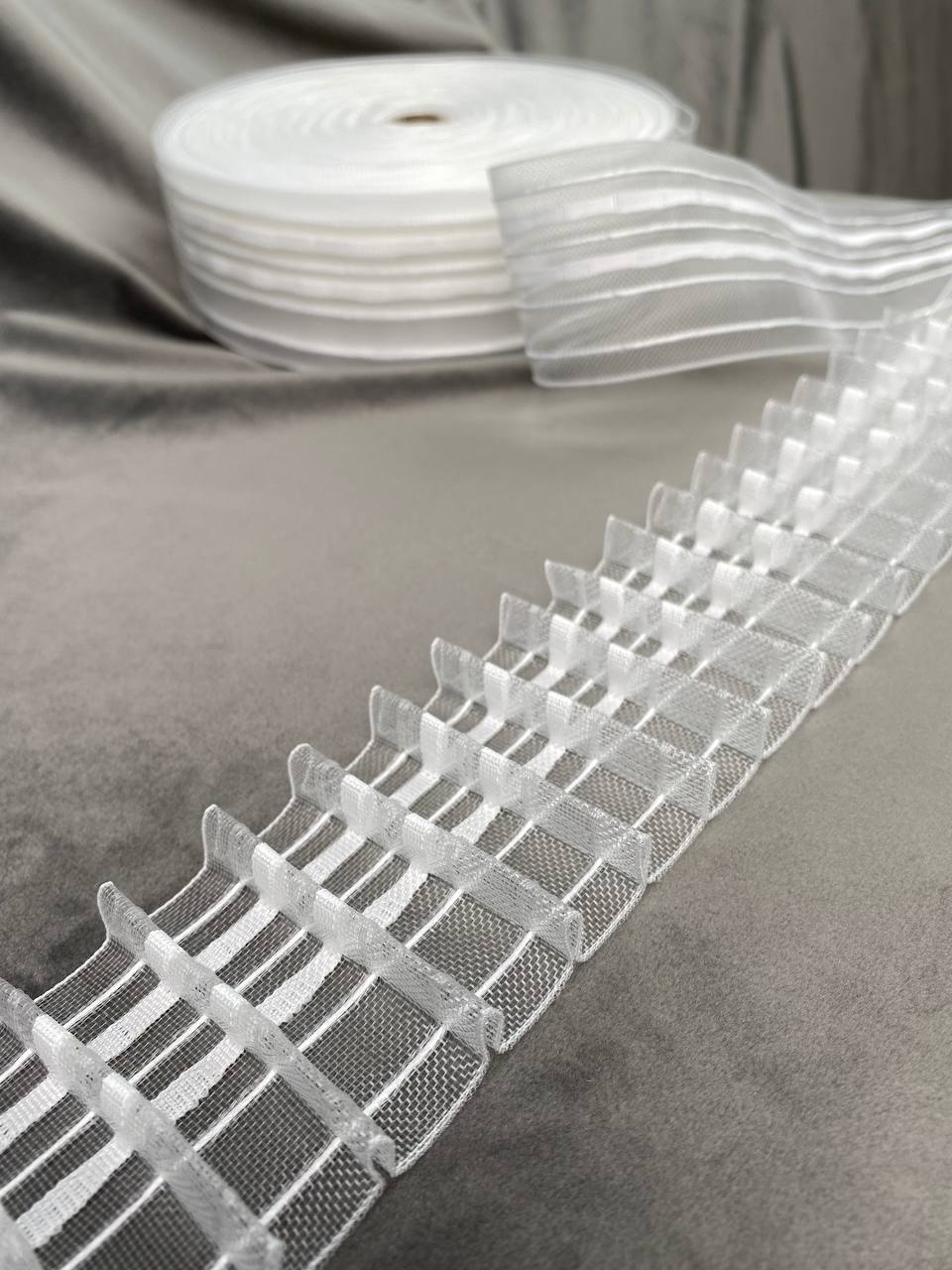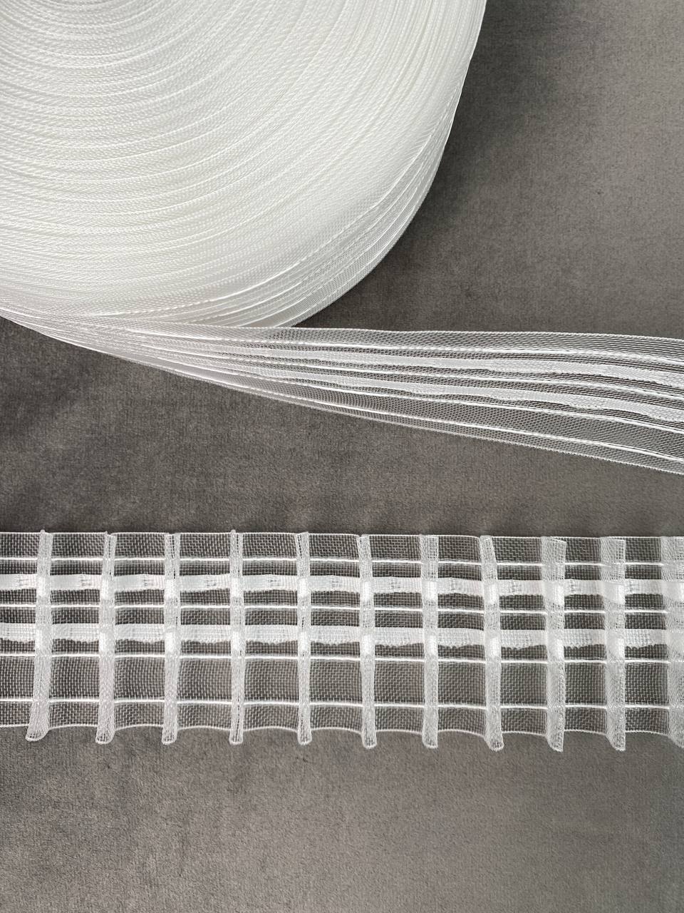 - Особенности: средняя ширина 6 см, фиксированные складки, низкая цена, пользуется большим спросом для пошива штор на маркетплайсы и эконом-объекты.