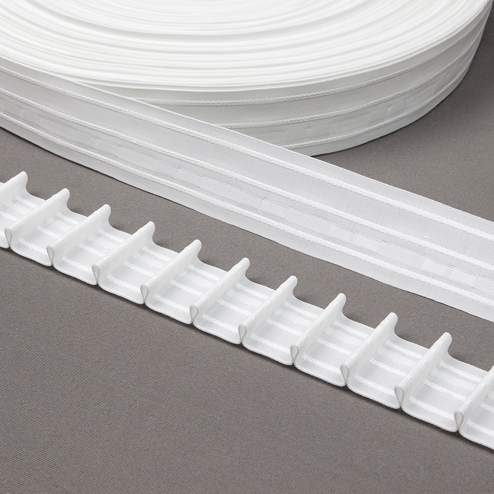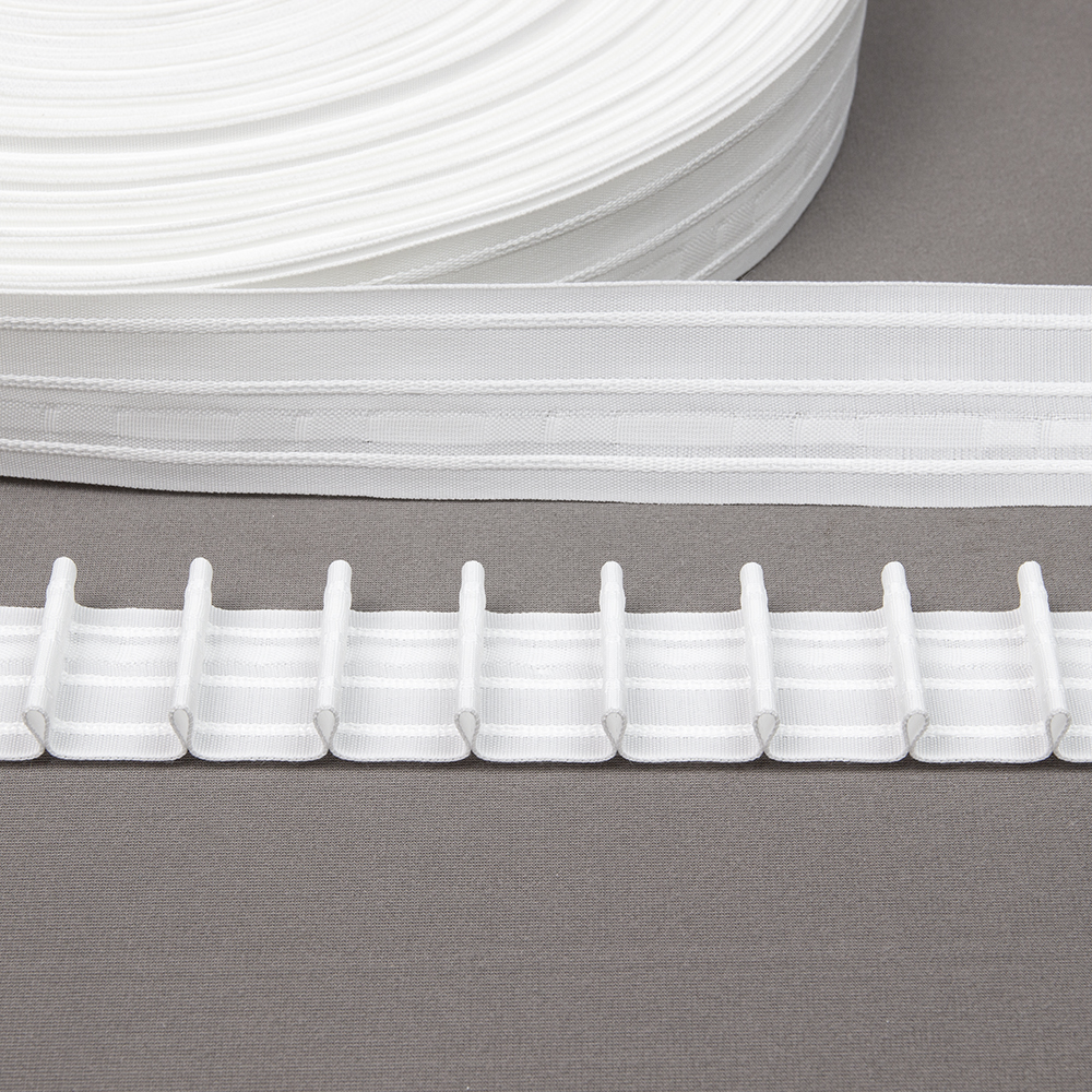 Особенности: узкая - 4 см, фиксированные складки, широкое расстояние между складками 2.5 см; имеет по 2 петли между складками, что позволяет одевать на каждую складку двойной крючок "Улитку", для более ровной посадки шторы на профильные карнизы с глайдерами. Часто применяема для коротких штор или штор в неглубокие ниши, чтобы не было видно шторной ленты. Так же популярна у производителей штор для маркетплейсов.