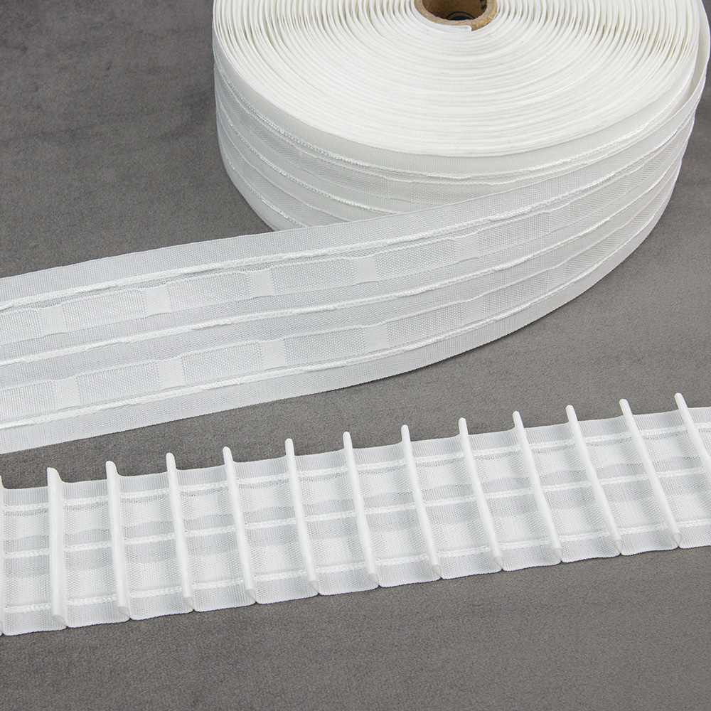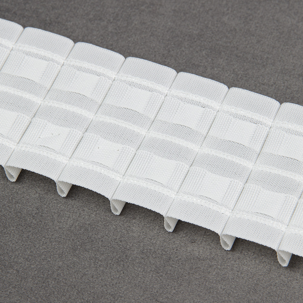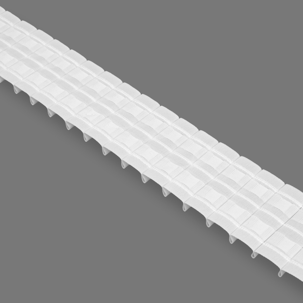 - Особенности: средняя ширина 6 см, фиксированные складки, большое расстояние от верхней петли до края ленты, двухстороння - петли по краям ленты расположены одинаково, подойдет для тяжелых тканей, на нижнею петлю можно фиксировать съемную подкладку для шторы.