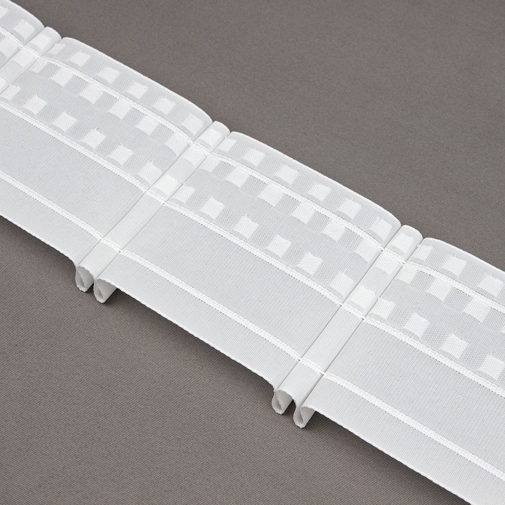 Особенности: широкая 10 см, экономный коэффициент 1:1.8, фиксированные складки, расположенные на расстоянии друг от друга, помогут красиво драпироваться шторам при их раскрытии. Три ряда карманов, что позволяет не дошивать гребешок у шторы и регулировать высоту готового изделия. Подойдет для тонких и средней толщины тканей. Большой выступ складки - учитывать ширину ниши и расстояние между направляющими. Учитывать отступ ленты назад при раскрывании шторы. Принадлежит к серии лент с разным коэффициентом: 1:1.8, 1:2, 1:2.5 (прозрачные и тканевые). Есть прозрачный компаньон 4361МP (1:1.8). Из этой ленты можно создать двойные лучевые складки с эффектом ручной закладки, для этого после стягивания шторной ленты кордами, нужно два ровных луча зафиксировать строчкой сверху или снузу ленты вместе с тканью.