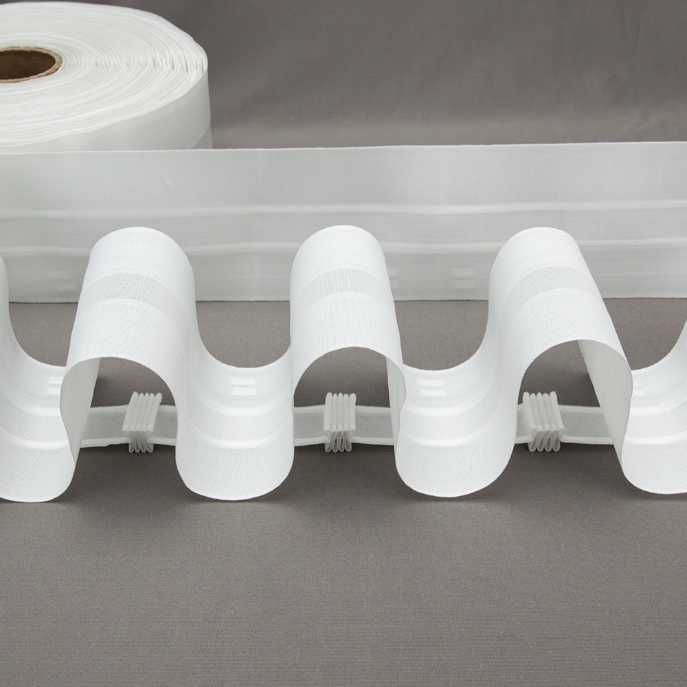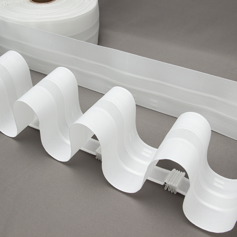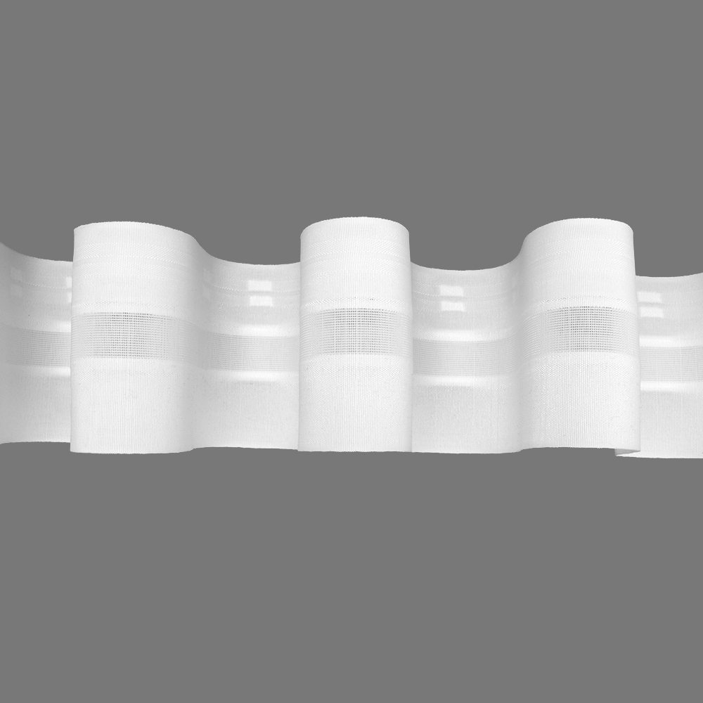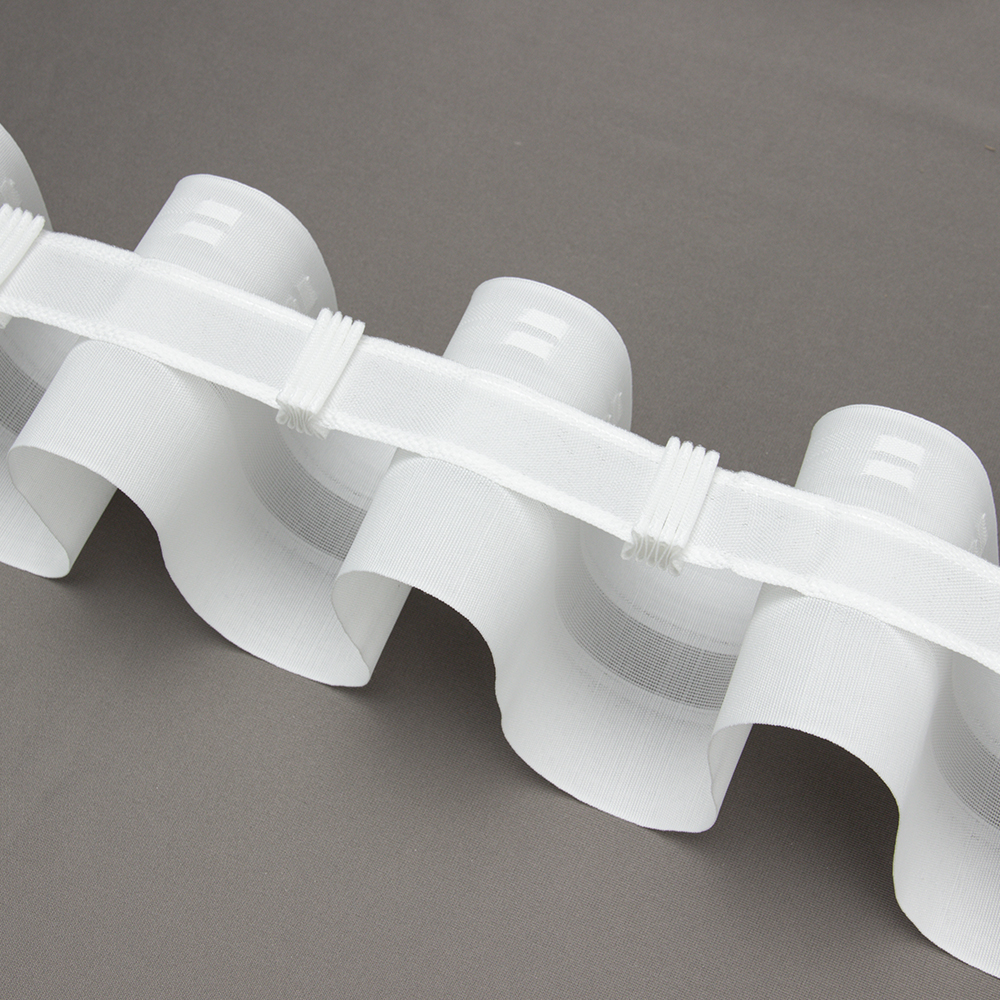 Особенности: широкая 10 см, с увеличенным коэффициентом 1:2.5, фиксированная сборка, большое расстояние от верхней петли до края ленты. Большой выступ складки. Подойдет для легких и средней тяжести тканей. Можно использовать для легких портьер. Полупрозрачная сетка, в центре ленты, имеет в составе леску, которая усиливает форму складки. Принадлежит к серии лент ВК "Волна" с разными коэффициентами: 1:1.5,1:1.8, 1:2, 1:2.5 (белые, черные, прозрачные).