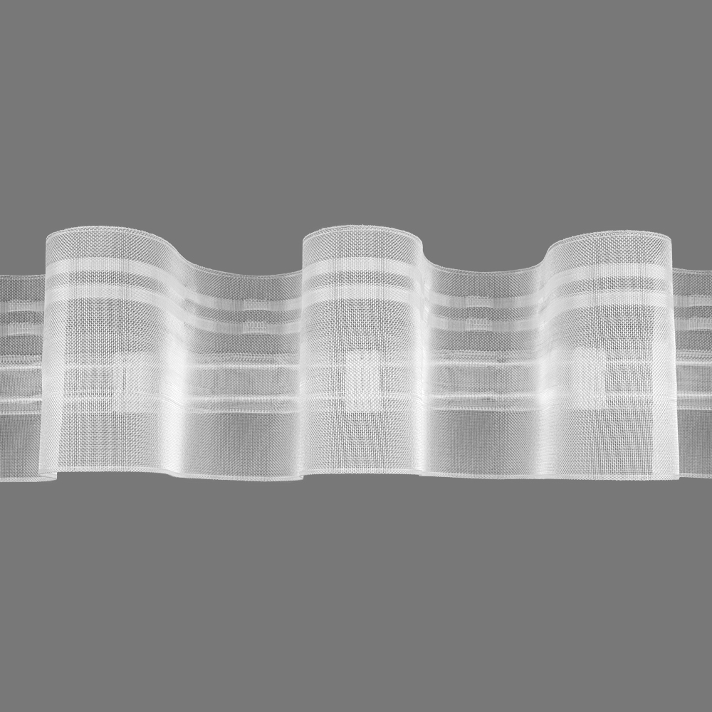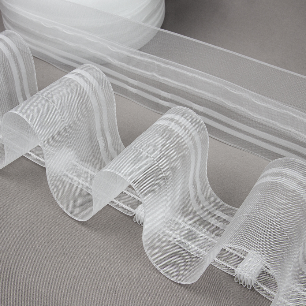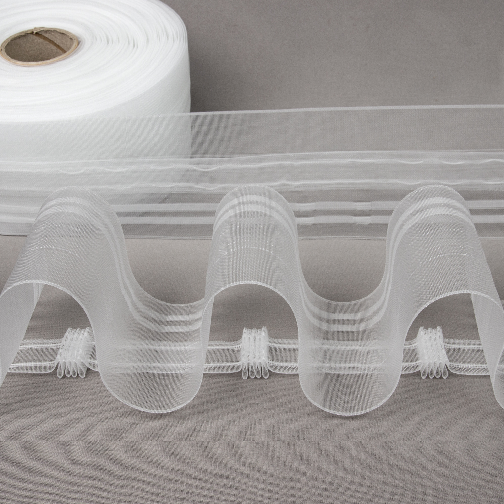 Особенности: широкая 10 см, с увеличенным коэффициентом 1:2.5, фиксированная сборка, большое расстояние от верхней петли до края ленты. Большой выступ складки. Подойдет для легких тканей. Можно использовать для легких портьер. Принадлежит к серии лент ВК "Волна" с разными коэффициентами: 1:1.5,1:1.8, 1:2, 1:2.5 (белые, черные, прозрачные).
