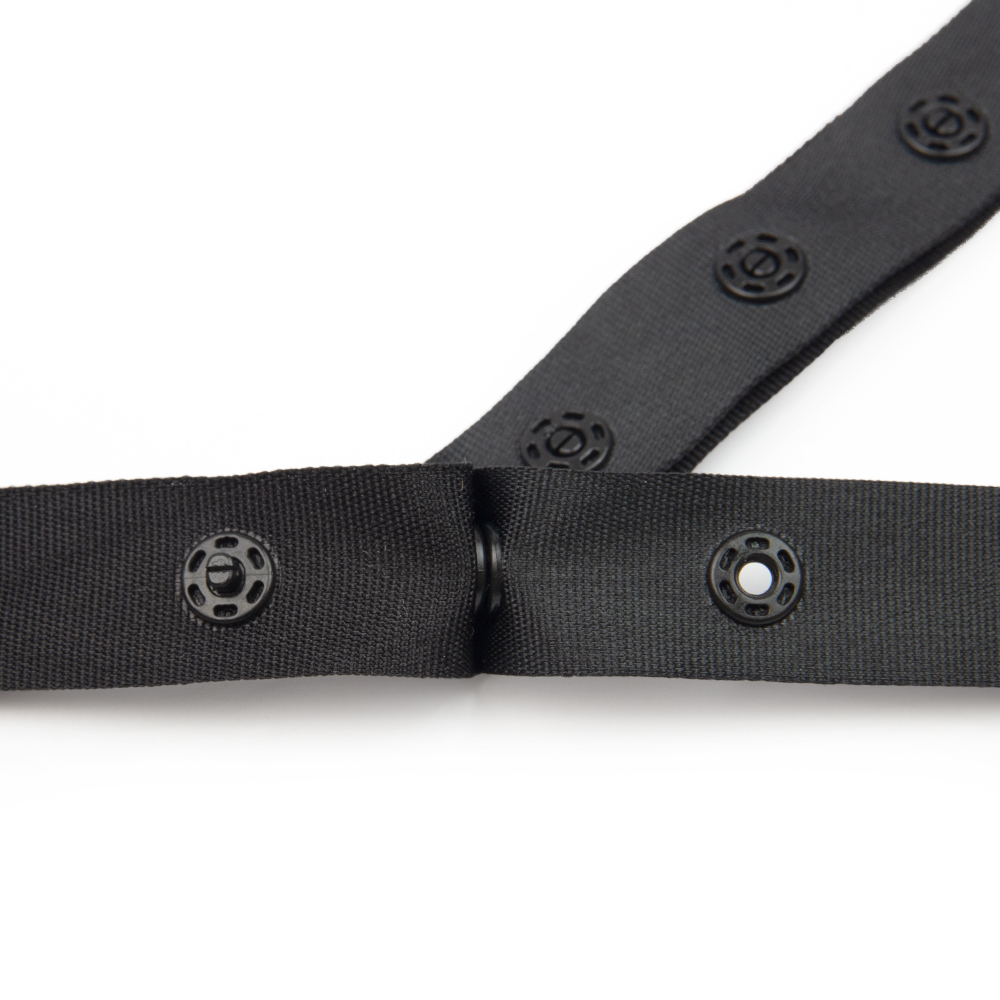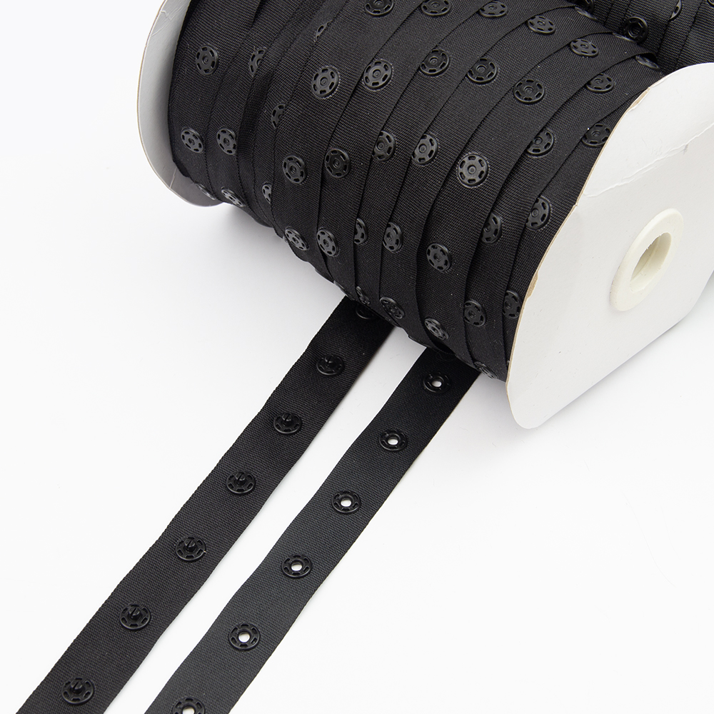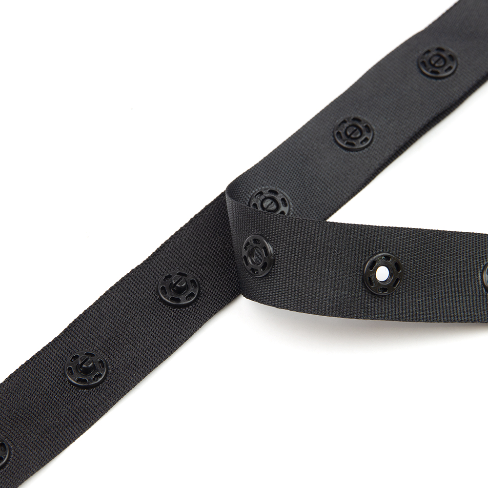 Тесьма с кнопками - это функциональная тесьма состоящая из комплекта двух репсовых лент с установленными на них пластиковыми кнопками. Соединение лент происходит за счет соединения (застежки) кнопок.
