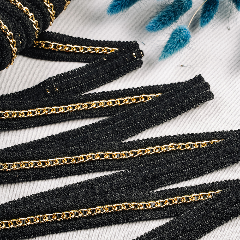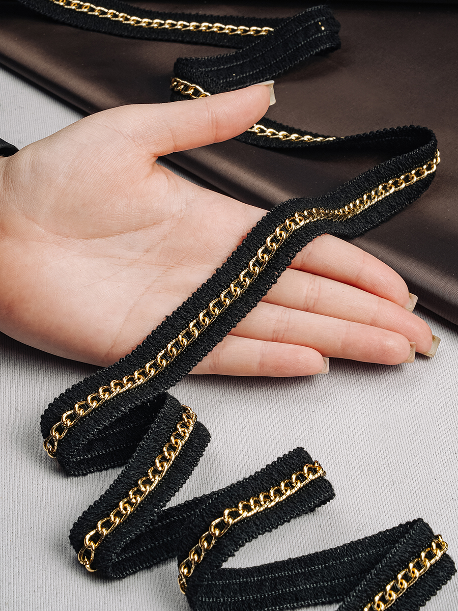 тесьма с металлической цепочкой. Может использоваться как декоративный элемент на женскую группу одежды и в кожгалантереи.У нас в наличии Тесьма с металлической цепочкой HT P13 русское золото, артикул 00027892 в отличном качестве.