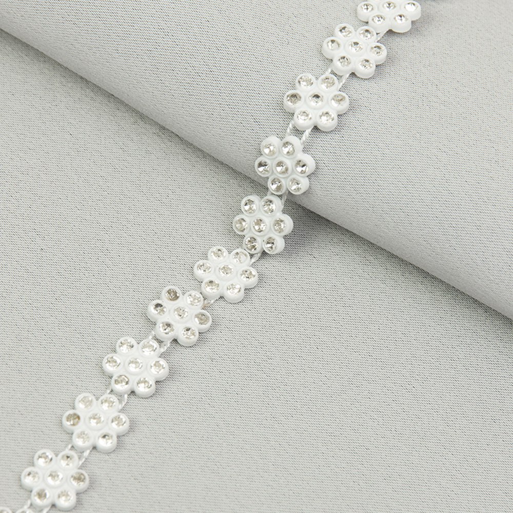 Тесьма со стразами- это лента из страз, заключенных в оправу из пластика. Применяется для отделки одежды и аксессуаров.У нас в наличии Тесьма со стразами цветочек 65-В/7/1Х белая, артикул 00024336 в отличном качестве.