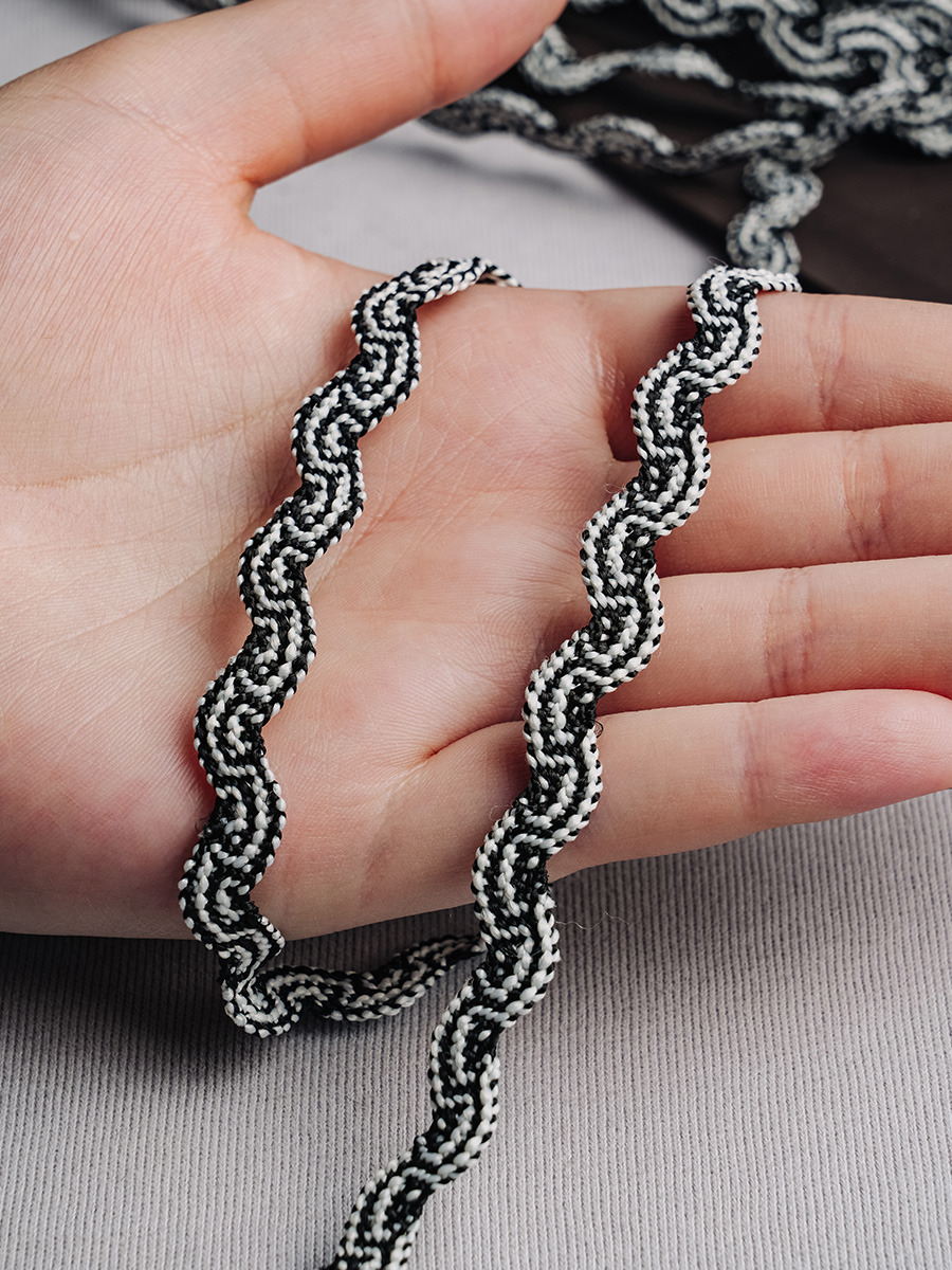 Тесьма-это особая декоративная ткань,выпускаемая в виде полос или лент разной ширины. Тесьма используется,как правило,для конечной отделки уже готовых изделий.У нас в наличии Тесьма-вьюнок 1-126 белый/черный, артикул 00028461 в отличном качестве.