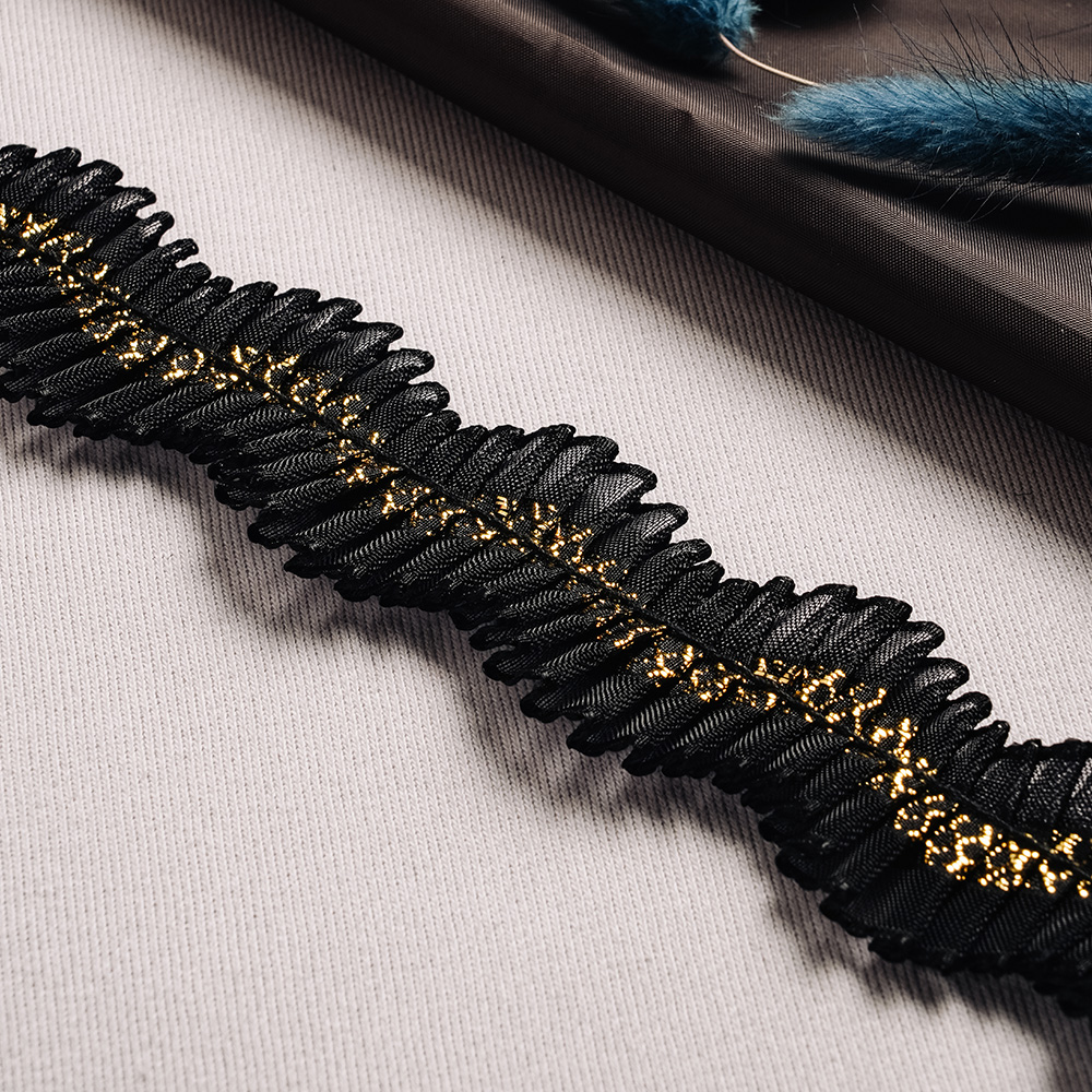 Тесьма-оборка - полоса материи,собранная с одной стороны и прошитая складками или сборками. Применяется для декоративной отделки изделий из текстиля.У нас в наличии Тесьма-оборка 08HT-85 черный/золото, артикул 00002152 в отличном качестве.