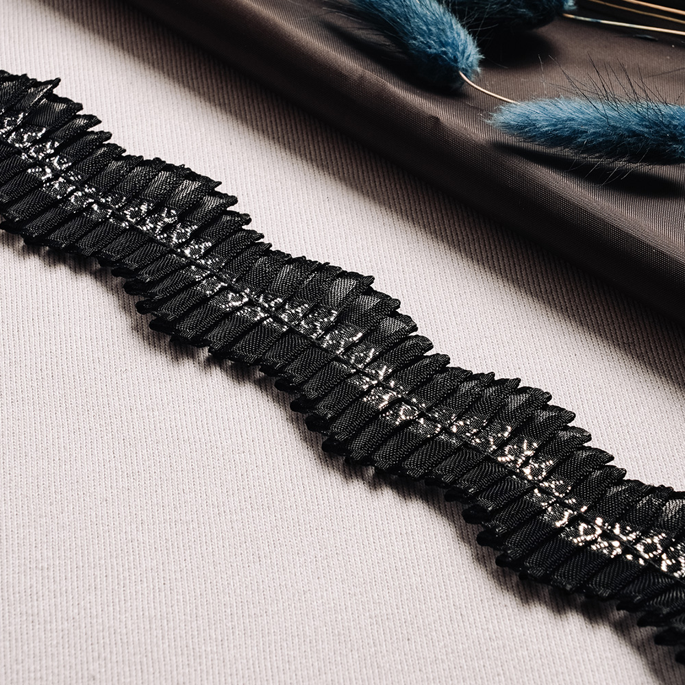 Тесьма-оборка - полоса материи,собранная с одной стороны и прошитая складками или сборками. Применяется для декоративной отделки изделий из текстиля.У нас в наличии Тесьма-оборка 08HT-86 черный/серебро, артикул 00002153 в отличном качестве.