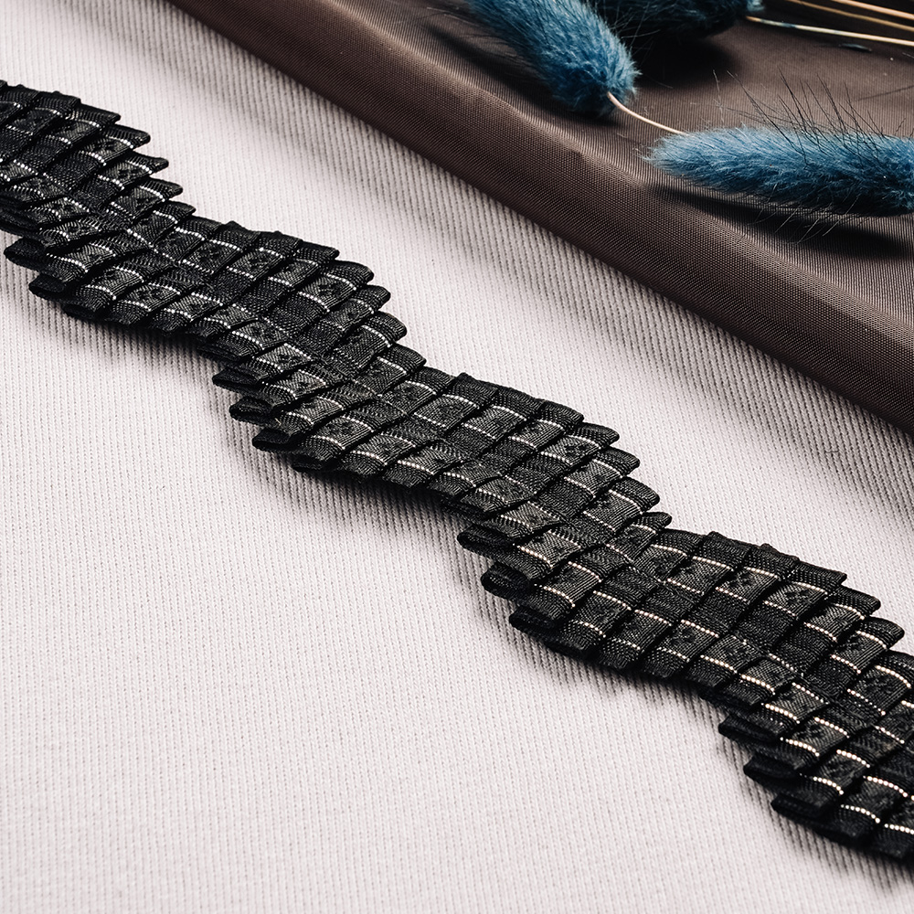 Тесьма-оборка - полоса материи,собранная с одной стороны и прошитая складками или сборками. Применяется для декоративной отделки изделий из текстиля.У нас в наличии Тесьма-оборка 08HT-88 черный, артикул 00002154 в отличном качестве.