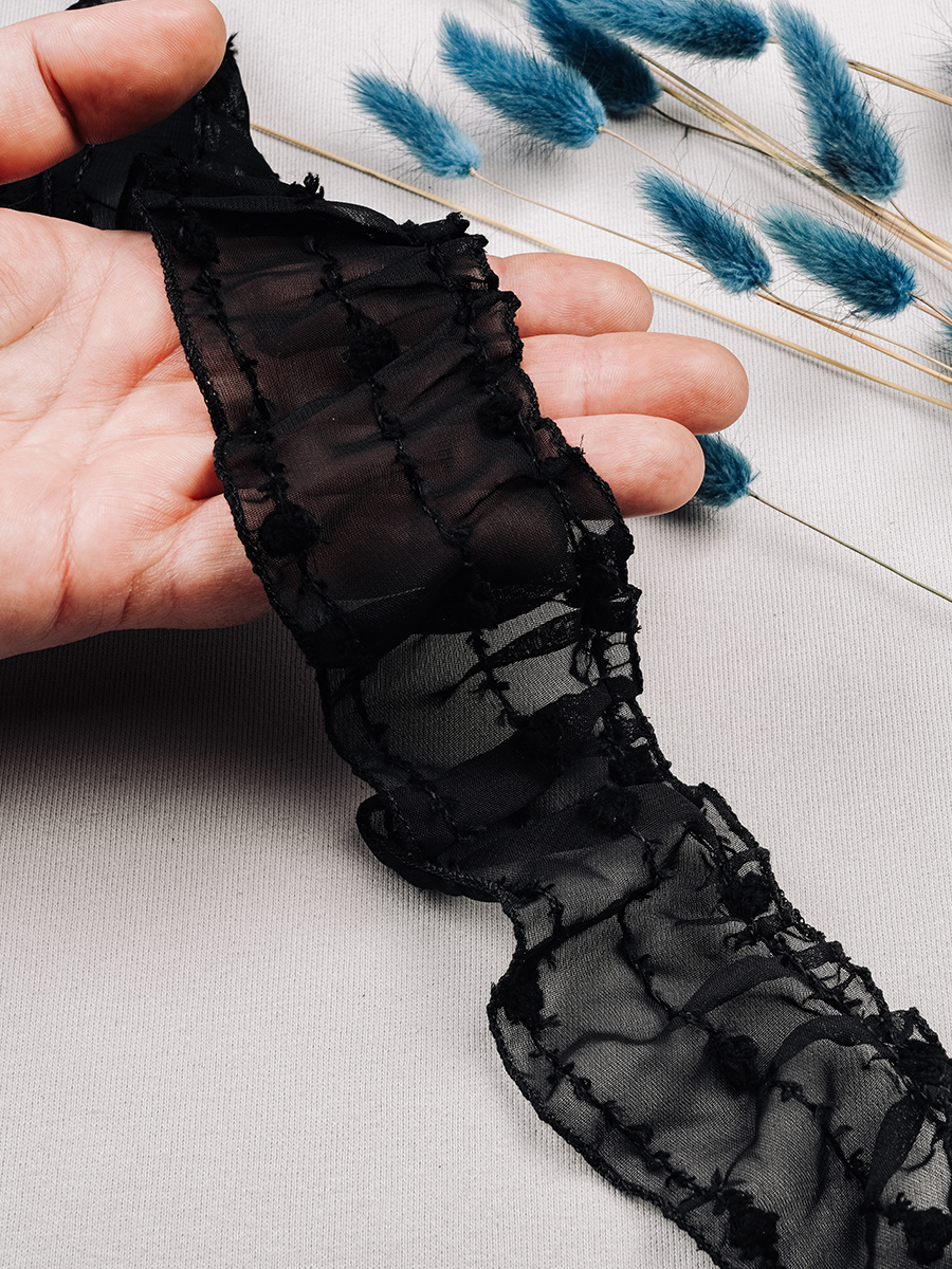 Оборка-полоса материи,собранная с одной стороны и прошитая складками или сборками.В зависимости от стиля и типа изделия, для украшения используют однослойные или двухслойные оборки.Однослойные изготавливаются из присборенной одинарной полоски ткани.Внешний край оборки отделывается двойной подгибкой или контрастным по цвету кантом.Для изготовления двухслойной оборки ткань складывается пополам по ширине.Двойной слой ткани придает оборке объемность и плотность,а сгиб делает ее очертания плавными и четкими.Кроме того,двойная оборка хорошо держит форму и не обвисает.У нас в наличии Тесьма-оборка 1086HT черный, артикул 00021543 в отличном качестве.