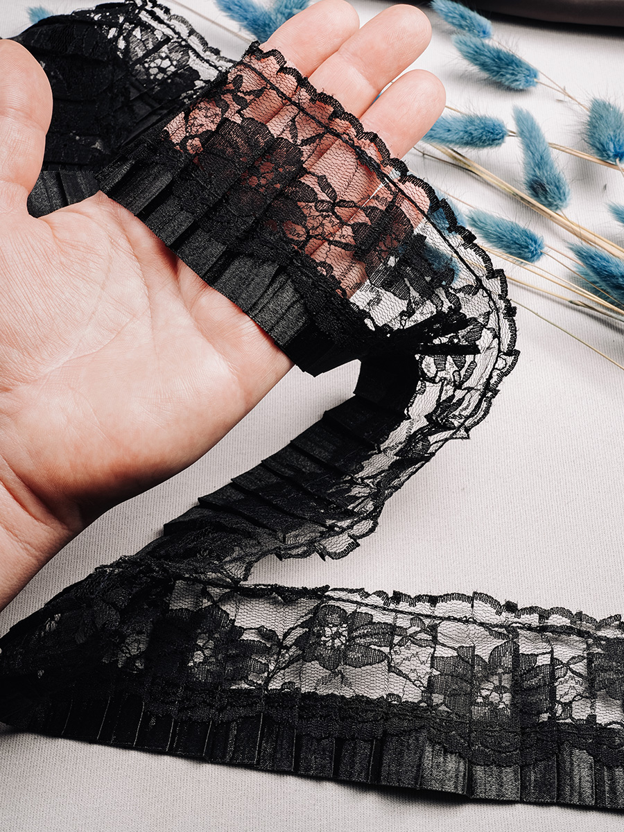 Оборка-полоса материи,собранная с одной стороны и прошитая складками или сборками. Применяется для декоративной отделки изделий из текстиля.У нас в наличии Тесьма-оборка 234-1HT черный, артикул 00018421 в отличном качестве.