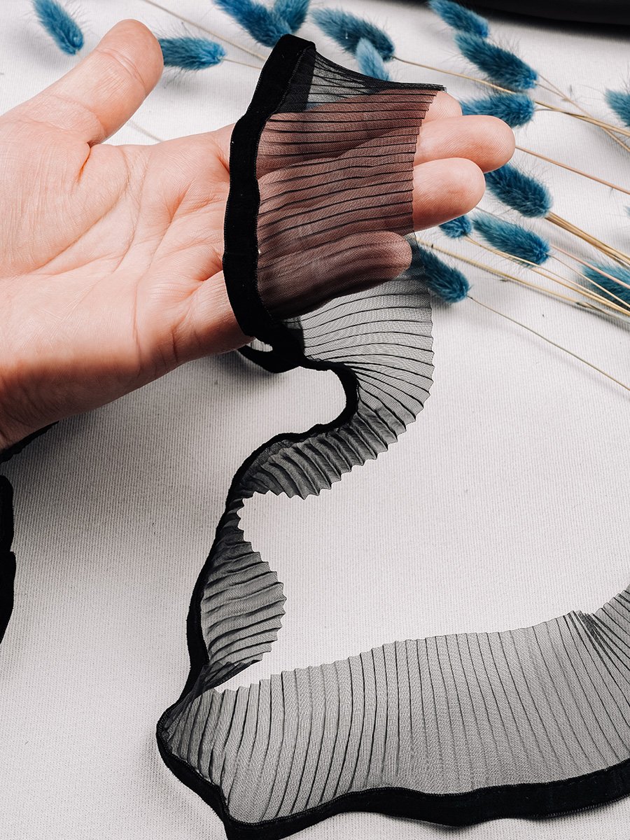 Оборка-полоса материи,собранная с одной стороны и прошитая складками или сборками. Применяется для декоративной отделки изделий из текстиля.У нас в наличии Тесьма-оборка 418-1HT черный, артикул 00018423 в отличном качестве.