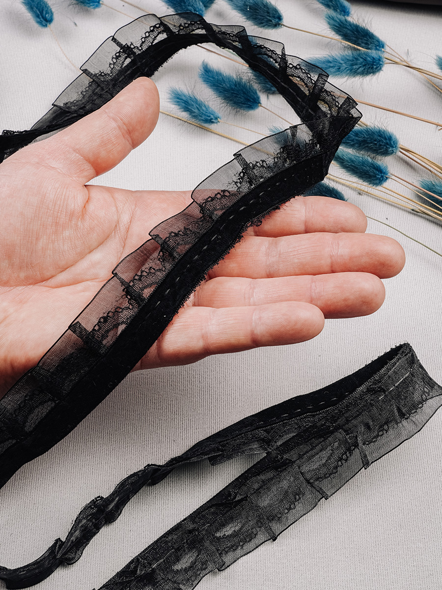 Оборка-полоса материи,собранная с одной стороны и прошитая складками или сборками. Применяется для декоративной отделки изделий из текстиля.У нас в наличии Тесьма-оборка 714HT черный, артикул 00020415 в отличном качестве.