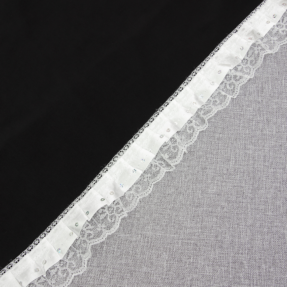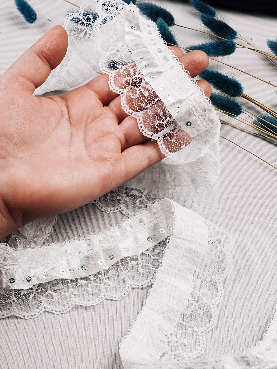 Оборка-полоса материи,собранная с одной стороны и прошитая складками или сборками. Применяется для декоративной отделки изделий из текстиля.У нас в наличии Тесьма-оборка с пайетками 627HT-W белый, артикул 00017309 в отличном качестве.