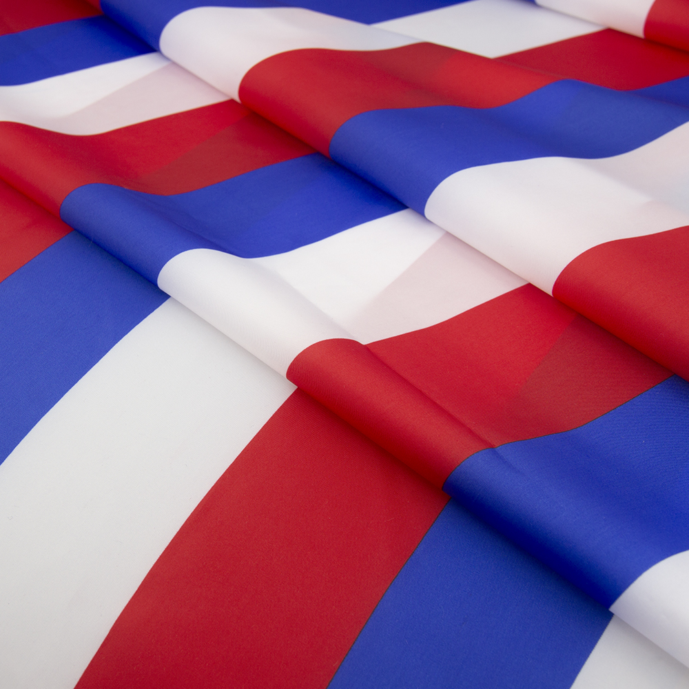 Флаговая ткань применяется в оформлении государственных праздников России, политических мероприятий, городских торжеств, значимых спортивных, культурных, коммерческих событий обязательно участвует официальная символика, в первую очередь – флаги. Легкий, прочный, яркий материал (100% полиэстер) может использоваться в помещениях и под открытым небом, не сминается, очень красиво драпируется.