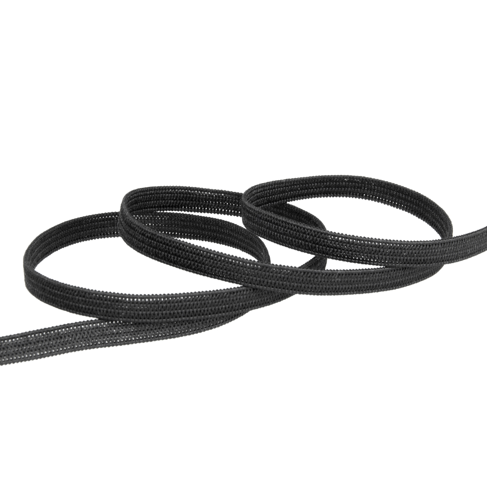 Вязанная резинка. состав: латекс, обвязанный п/а + п/э нитью. Назначение и свойства: За счёт каландрирования, резинка остается достаточно прочной, не дает усадки, не растягивается. Применяется при пошиве верхней одежды, нижнего белья, обуви, кожгалантирейных изделий и пр.У нас в наличии Резинка SF 3822-06 черный, артикул 00002308 в отличном качестве.