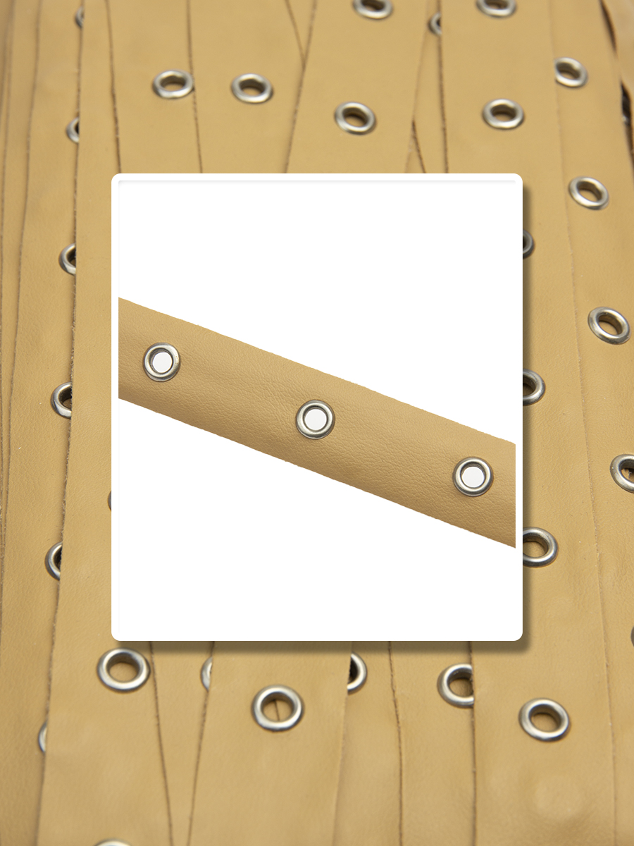 Полоса кожзам с люверсами. Применяется для декоративной отделки изделий из текстиля, а также при изготовлении головных уборов и кожгалантереи.У нас в наличии Полоса кожзам с люверсами 016-А бежевый, артикул 00005911 в отличном качестве.