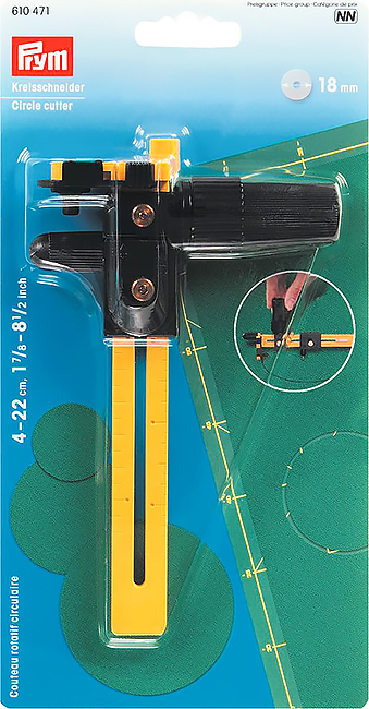 Круговой нож-циркуль Prym с лезвием для раскройного ножа демонстрирует высочайшее качество марки OLFA. С помощью кругового ножа-циркуля можно легко и с удобством вырезать из ткани окружности радиусом 4-22 см. Круговой нож-циркуль устроен по принципу циркуля и представляет собой идеальный инструмент для пэчворка, квилтинга и и других видов шитья и рукоделия. Будь то круглые аппликации, матерчатые йо-йо или пэчворк и квилтинг из круглых деталей: следует просто расправить ткань на коврике для раскройных ножей, отрегулировать циркуль до желаемого радиуса, снять защитный колпачок и разблокировать лезвие. Использование фиксирующих гирь Prym при этом предотвращает соскальзывание тяжелых тканей. Ручка кругового ножа-циркуля оснащена функцией регулирования, что позволяет устанавливать размер окружности.