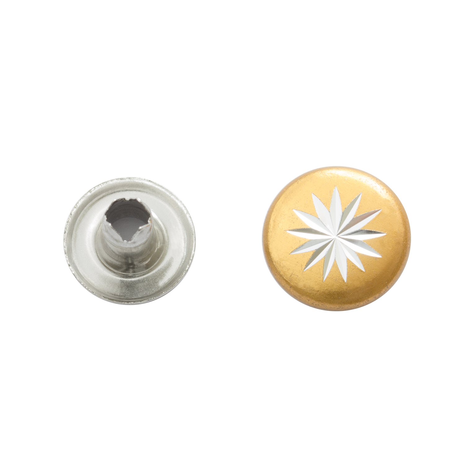 Хольнитен представляет собой заклепку, предназначенную для скрепления деталей одежды, прикрепления к ним фурнитутуры и декоративного оформления изделия. Хольнитены легко устанавливаются на швейное изделие как машинами, прессами, так и вручную, при этом не нужно заранее делать отверстие. В продаже имеются насадки. Хольнитены используются на джинсовые, кожгалантерейные изделия, обувь.У нас в наличии Хольнитены 799F-XD золото, артикул 00003249 в отличном качестве.